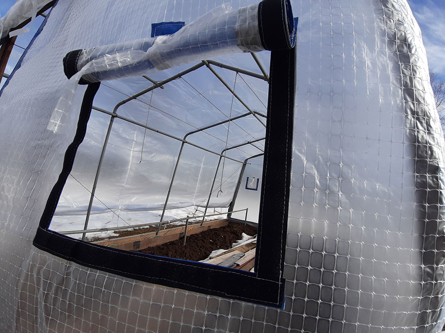 По низу добавлен материал пленки, чтобы чехол доставал до земли. Но все равно мы рекомендуем обустроить низ теплицы фундаментом из бруса или толстой доски, чтобы было к чему крепить и прижимать чехол.
